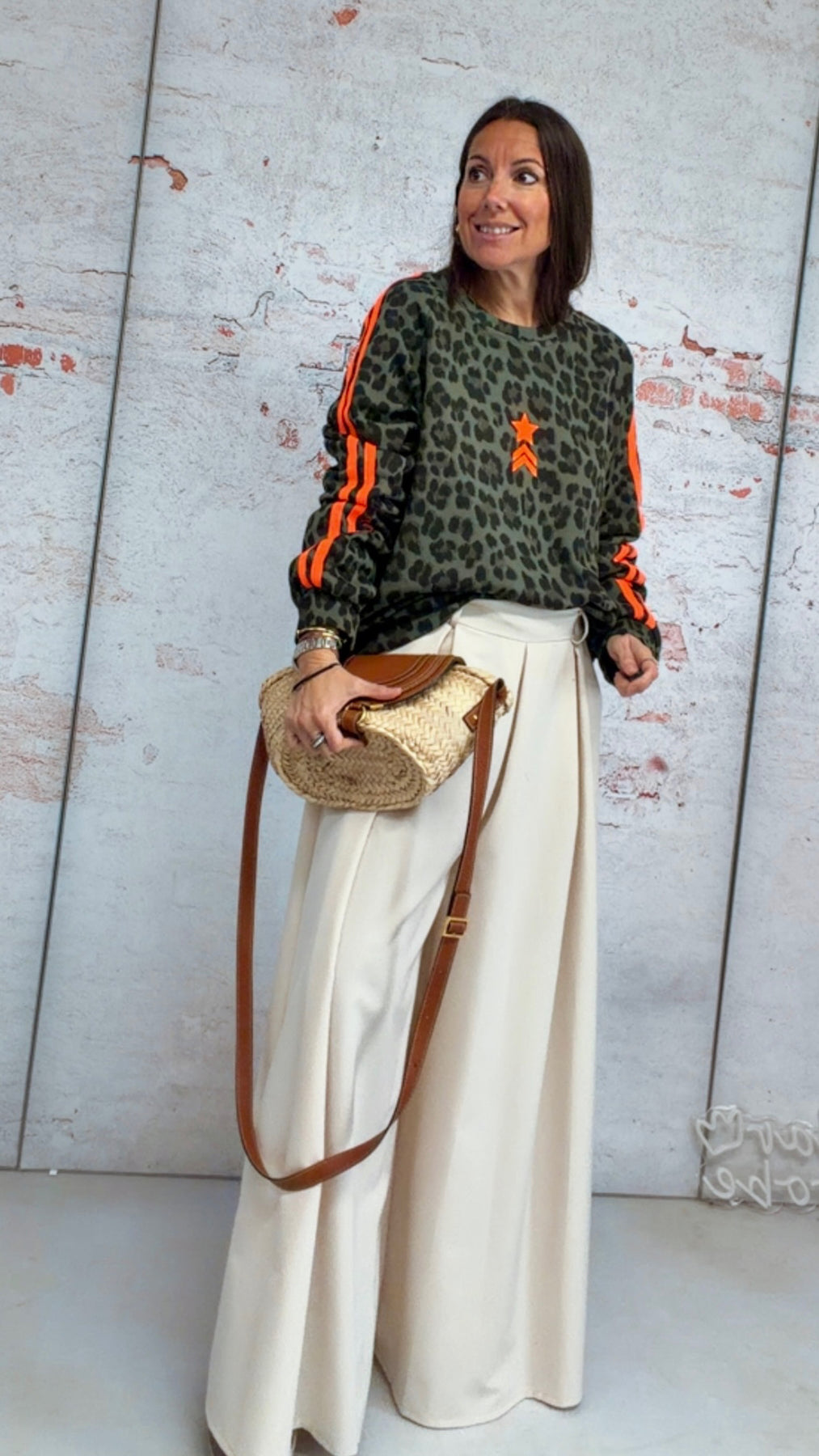Sudadera talla única, print leopardo en fondo verde, marrón y negro. con rayas y detalles en naranja flúor. Talla S a L. Medida de sisa: 60 cm. Largo: 62 cm.