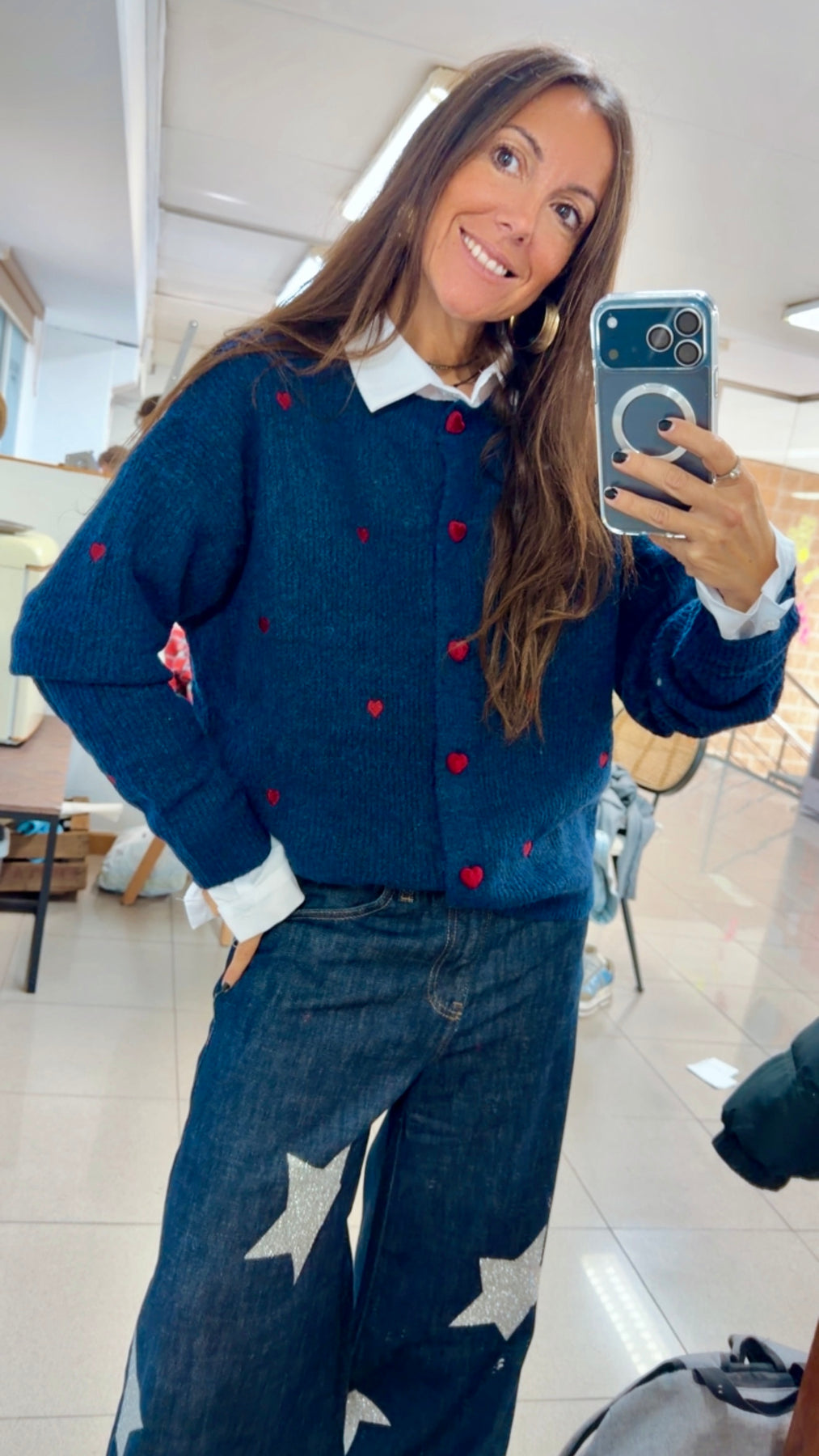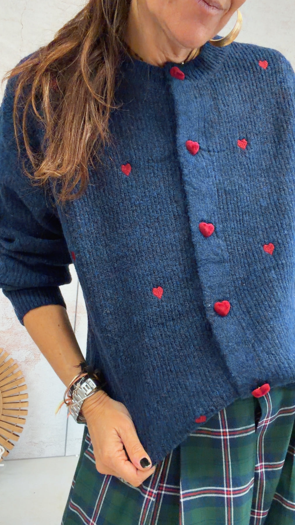 Talla única. Jersey azul marino. Botones granates en forma de corazón de terciopelo y corazones bordados.